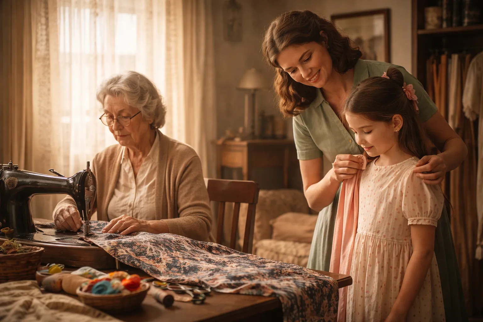 Algunos ejemplos de esta práctica incluyen el traspaso de ropa a hijos e hijas, donde cada prenda estaba imbuida de la historia de quien la usó previamente. Las madres, abuelas y abuelos podrían modificar y personalizar estas prendas, adaptándolas a las necesidades y estilos de sus descendientes, lo que a su vez fortalecía la conexión entre distintas generaciones y fomentaba un sentido de identidad familiar. Este enfoque también promovía una visión sostenible de la moda, en contraposición a la cultura de consumo actual.